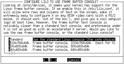If kernel frame buffer support is compiled into your kernel, liloconfig will ask which video resolution you would like to use. This is the resolution that is also used by the XFree86 frame buffer server. If you do not want the console to run in a special video mode, selecting normal will keep the standard 80x25 text mode in use.