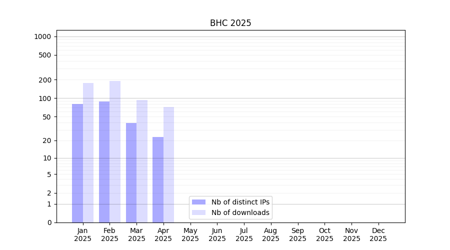 Number of downloads for software package BHC, year by year, from 2025 back to 2014 (years with no downloads are omitted):