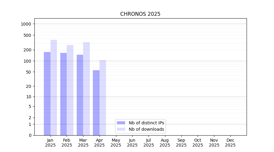 Number of downloads for software package CHRONOS, year by year, from 2025 back to 2014 (years with no downloads are omitted):