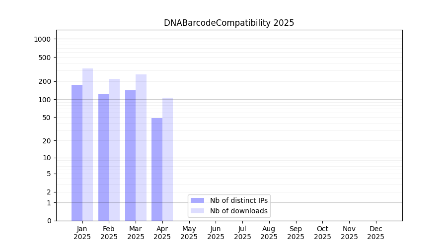 Number of downloads for software package DNABarcodeCompatibility, year by year, from 2025 back to 2014 (years with no downloads are omitted):