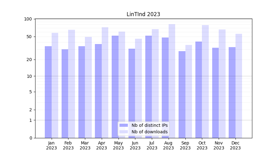 Number of downloads for software package LinTInd, year by year, from 2025 back to 2014 (years with no downloads are omitted):