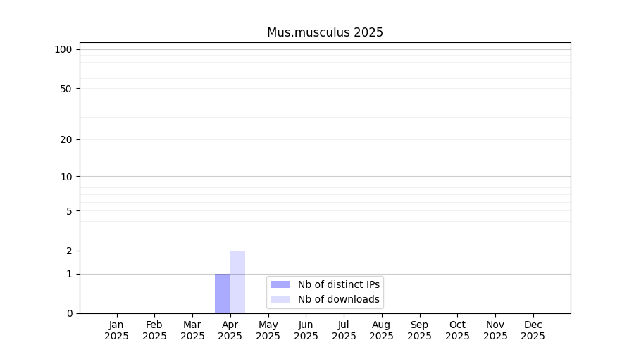 Number of downloads for software package Mus.musculus, year by year, from 2025 back to 2014 (years with no downloads are omitted):