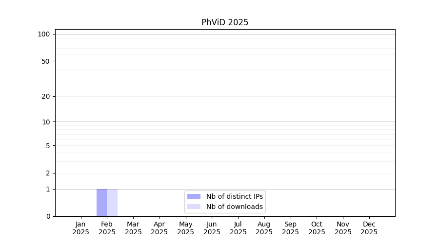 Number of downloads for software package PhViD, year by year, from 2025 back to 2014 (years with no downloads are omitted):