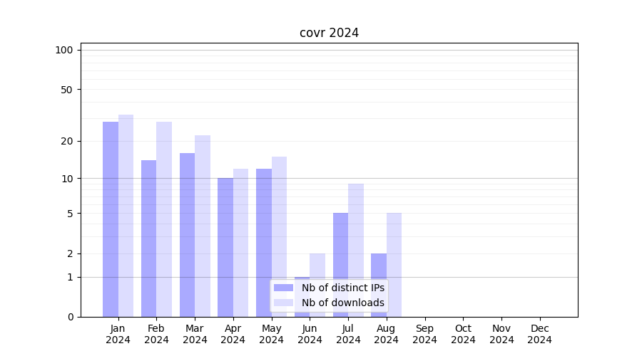 Number of downloads for software package covr, year by year, from 2025 back to 2014 (years with no downloads are omitted):