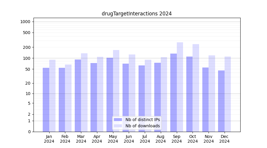 Number of downloads for software package drugTargetInteractions, year by year, from 2025 back to 2014 (years with no downloads are omitted):