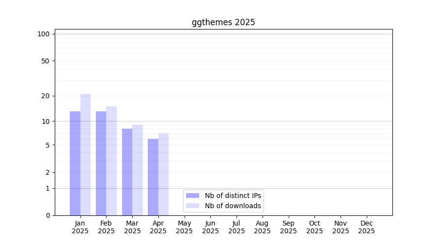 Number of downloads for software package ggthemes, year by year, from 2025 back to 2014 (years with no downloads are omitted):