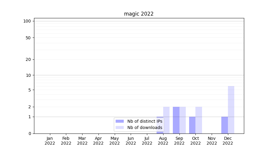 Number of downloads for software package magic, year by year, from 2025 back to 2014 (years with no downloads are omitted):