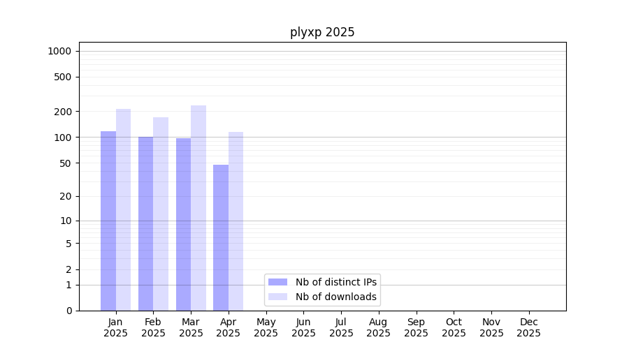Number of downloads for software package plyxp, year by year, from 2025 back to 2014 (years with no downloads are omitted):