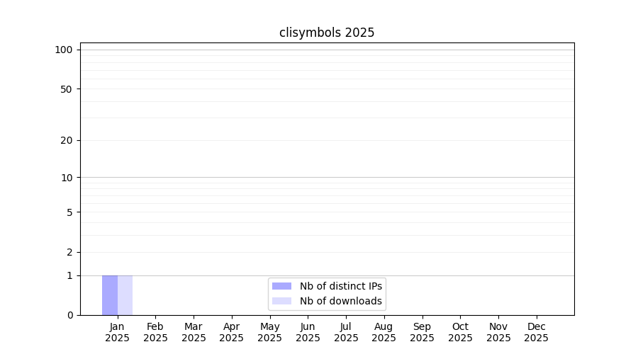 Number of downloads for annotation package clisymbols, year by year, from 2025 back to 2014 (years with no downloads are omitted):