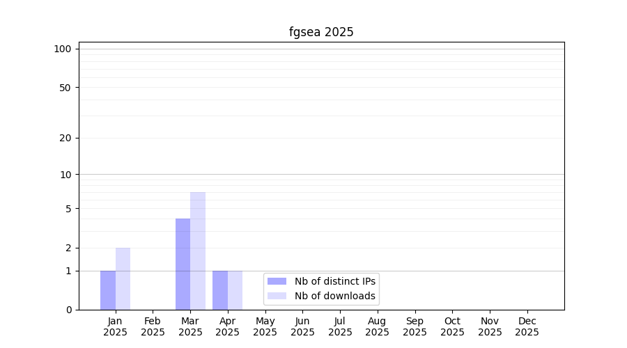 Number of downloads for annotation package fgsea, year by year, from 2025 back to 2014 (years with no downloads are omitted):