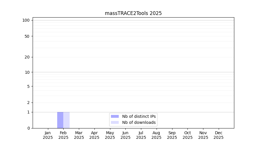 Number of downloads for annotation package massTRACE2Tools, year by year, from 2025 back to 2014 (years with no downloads are omitted):