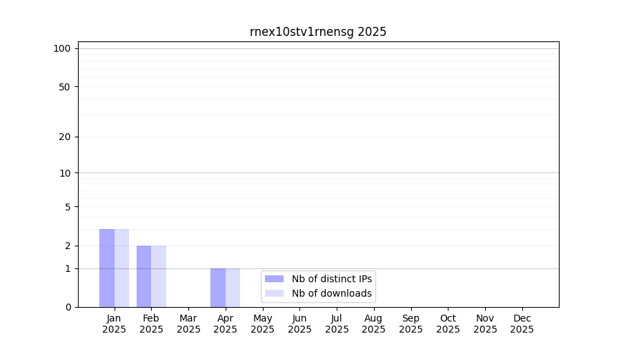 Number of downloads for annotation package rnex10stv1rnensg, year by year, from 2025 back to 2014 (years with no downloads are omitted):