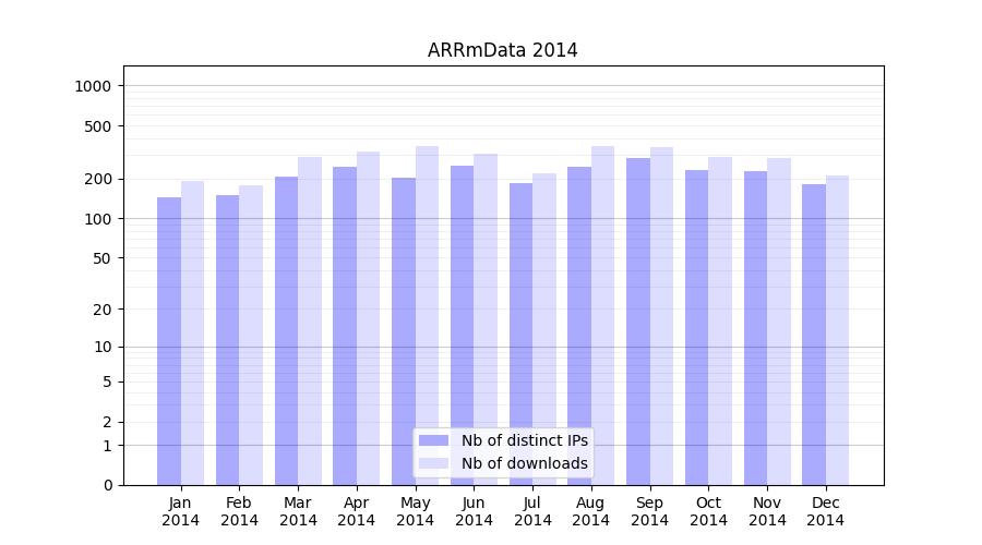 Number of downloads for experiment package ARRmData, year by year, from 2025 back to 2014 (years with no downloads are omitted):