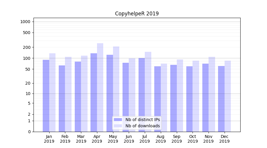 Number of downloads for experiment package CopyhelpeR, year by year, from 2025 back to 2014 (years with no downloads are omitted):