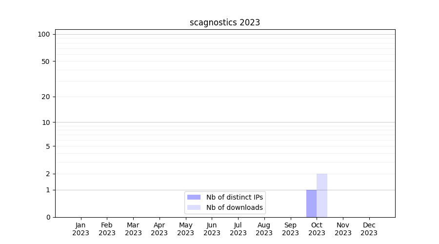 Number of downloads for experiment package scagnostics, year by year, from 2025 back to 2014 (years with no downloads are omitted):