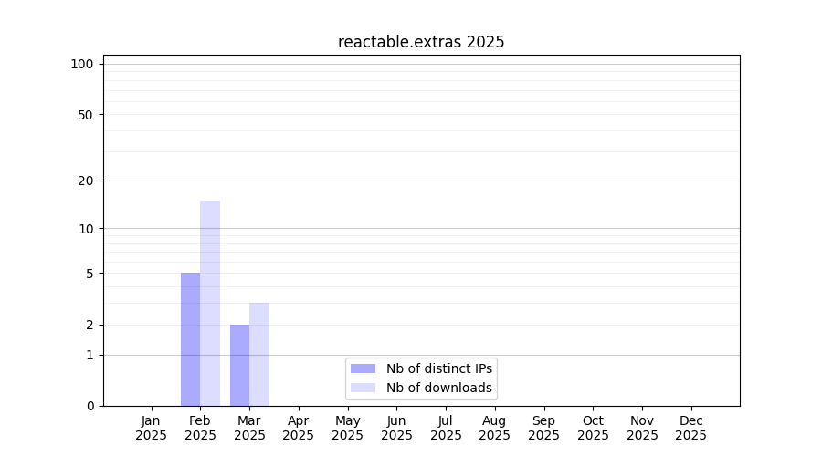 Number of downloads for workflow package reactable.extras, year by year, from 2025 back to 2015 (years with no downloads are omitted):