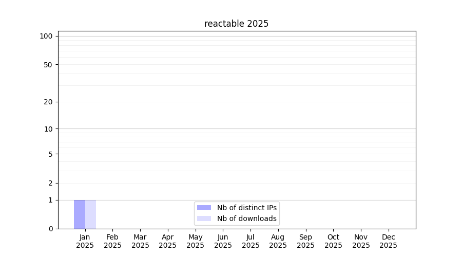 Number of downloads for workflow package reactable, year by year, from 2025 back to 2015 (years with no downloads are omitted):