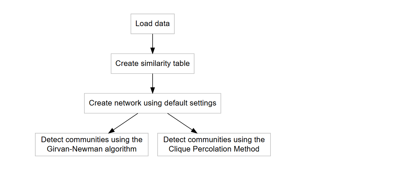 The first steps are visualized in the flowchart below, including community detection using either (or both) the Girvan-Newman algorithm (Girvan and Newman 2002) and Clique Percolation Method (Palla et al. 2005) for all clique sizes. Both methods are explained very well in the papers, and on wikipedia for both CPM and the Girvan-Newman algorithm.