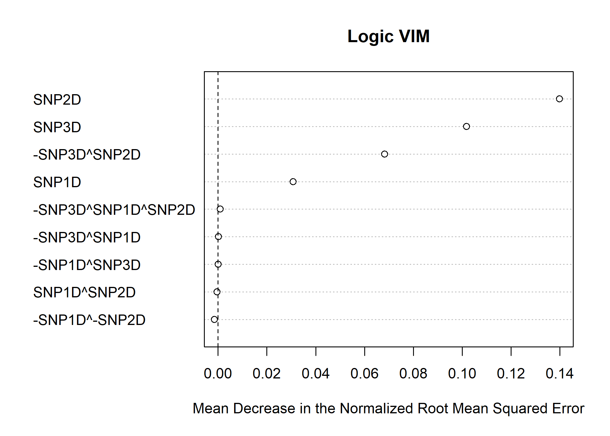 #> [1] 0.8761629Several VIMs and adjustment techniques for estimating the importances of interactions are implemented. For estimating VIMs, it is recommended to use bagged logicDT models, since they usually cover a wider range of input terms. Plus, no additional data set for an unbiased estimation is required, since for bagging, the OOB (out of bag) samples can be used.