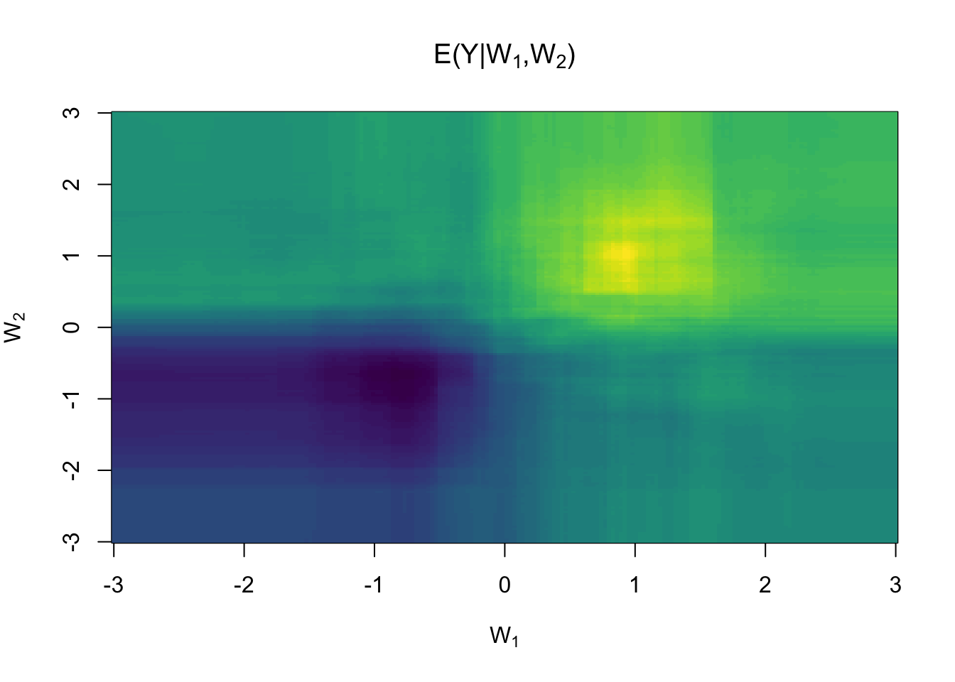 main=expression(paste("E(Y|",W[1],",",W[2],")")),
